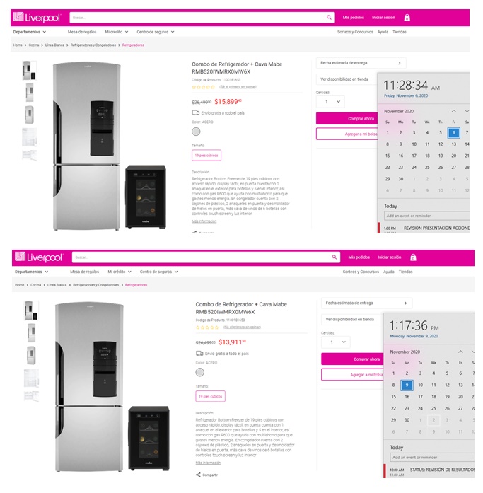 En este refrigerador sucede lo mismo. Vemos el día y la hora que se consultó el precio, el cual es aún más bajo del de lista y cuando comenzó el Buen Fin, el costo bajó más.