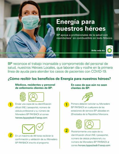 La empresa BP lanzó el programa Energía para nuestros héroes, una iniciativa que busca apoyar la economía de los profesionales de la salud con el reembolso de su carga de combustible, esto ante la pandemia del coronavirus SARS-CoV2, que causa la enfermedad covid-19.