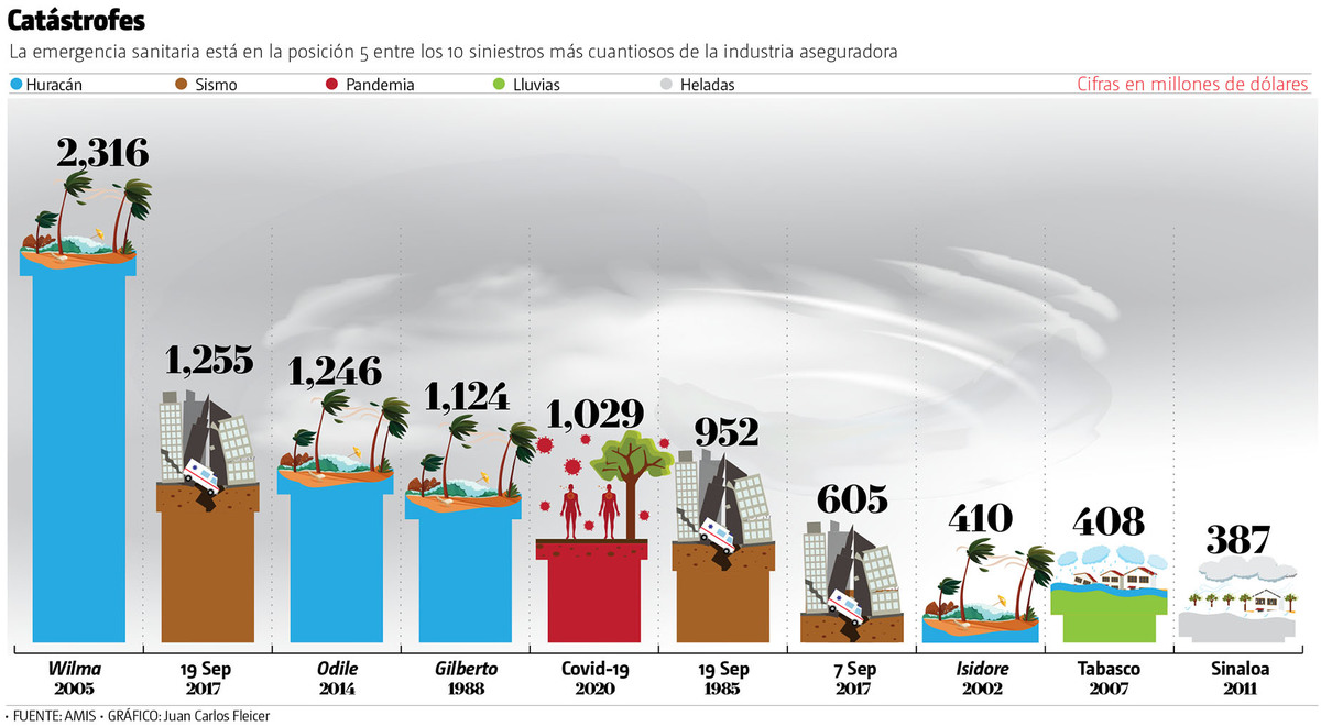 La pandemia subió al quinto lugar de los eventos catastróficos de mayor costo para las aseguradoras en el país, rebasando el terremoto del 19 de septiembre de 1985 de Ciudad de México, informó la Asociación Mexicana de Instituciones de Seguros (AMIS).