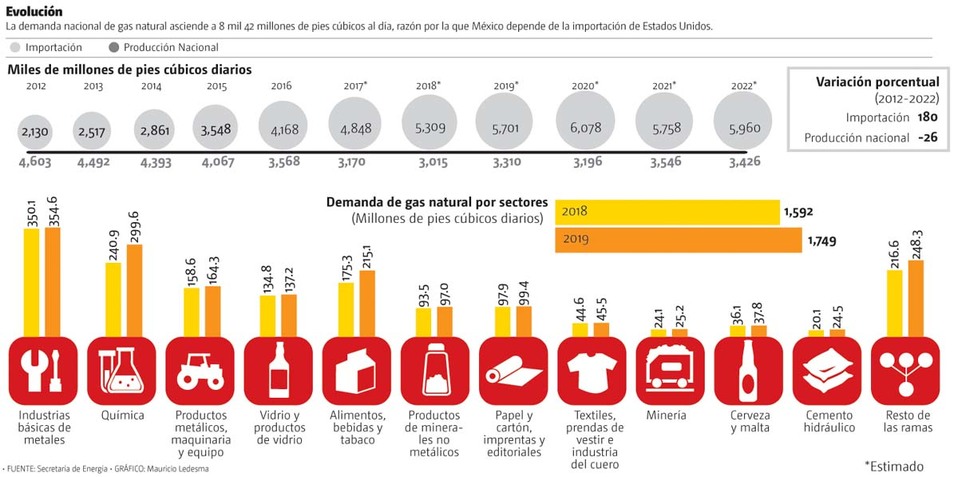 Las cifras muestran que México tiene un gran dependencia energética del gas natural de Estados Unidos, mientras que la producción nacional del energético a cargo de Petróleos Mexicanos alcanzó 5 mil 15 millones de pies cúbicos diarios, cuando la demanda nacional asciende a 8 mil 42 millones de pies cúbicos al día.