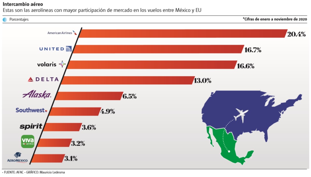 Datos de la Agencia Federal de Aviación Civil (AFAC) indican que las principales aerolíneas que operan en el mercado Estados Unidos-México son American Airlines, United Airlines, Volaris, Delta Airlines, Alaska Airlines y Aeroméxico, entre otras.