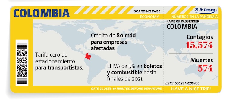 Colombia estableció una línea de crédito de alrededor de 80 mdd para empresas afectadas por el covid-19 en industrias de viaje, turismo y transporte, además de diferir plazos para pago de impuestos para firmas relacionadas con hotelería y transportación aérea.