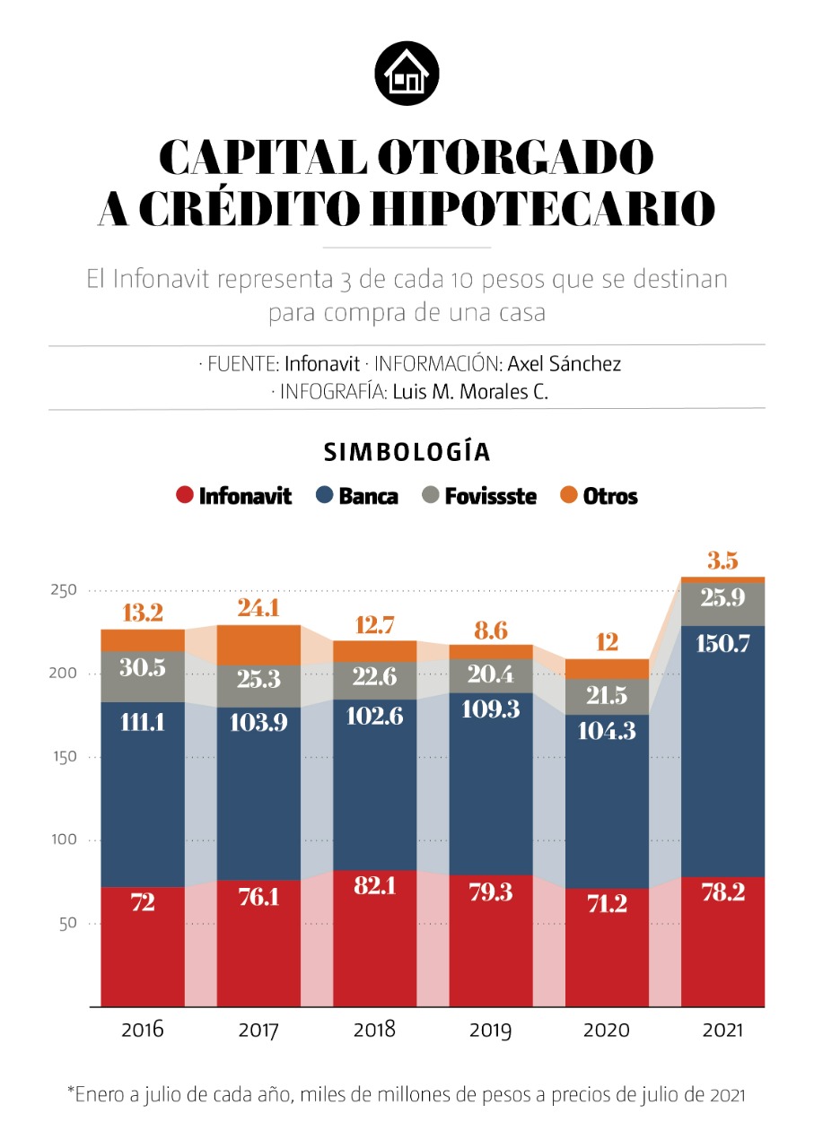 Información del mismo Infonavit muestra que en el primer semestre de 2021 los créditos hipotecarios sumaron 258 mil 300 millones de pesos, 24 por ciento más que el año pasado; el instituto representa de este monto 30 por ciento, es decir, 3 de cada 10 pesos que se prestan para la compra de una vivienda sale de las arcas de la agencia del gobierno.