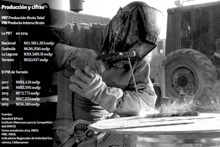 El PBT a nivel nacional en 2014 fue de $13,984,313 millones de pesos, el de Coahuila fue de $636,956 mdp, correspondiente al 4.53% del PBT nacional, en La Laguna fue de $211,589.31 mdp y para Torreón de 152,037 mdp.