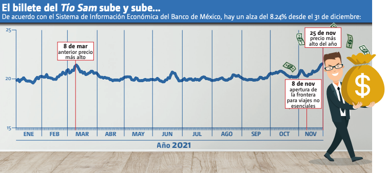 Un dato para destacar del histórico oficial es que el 8 de noviembre, día en que se tuvo la reapertura terrestre de las fronteras con Estados Unidos para los viajes no esenciales el tipo de cambio era de 20.32 pesos.