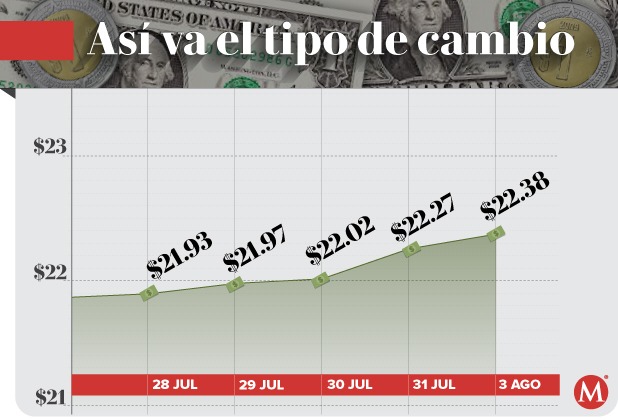 El peso mexicano inicia agosto con pérdidas, retrocediendo por quinta sesión consecutiva por un fortalecimiento generalizado del dólar ante el persistente nerviosismo debido al aumento en casos de coronavirus y mayores tensiones entres Estados Unidos y China.