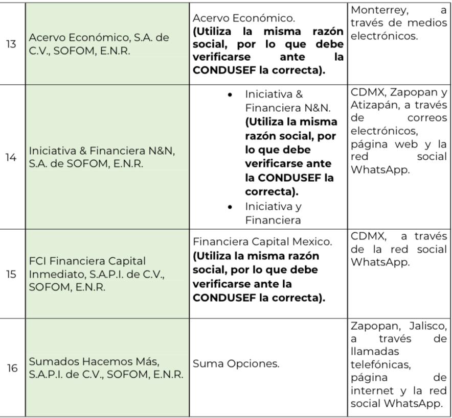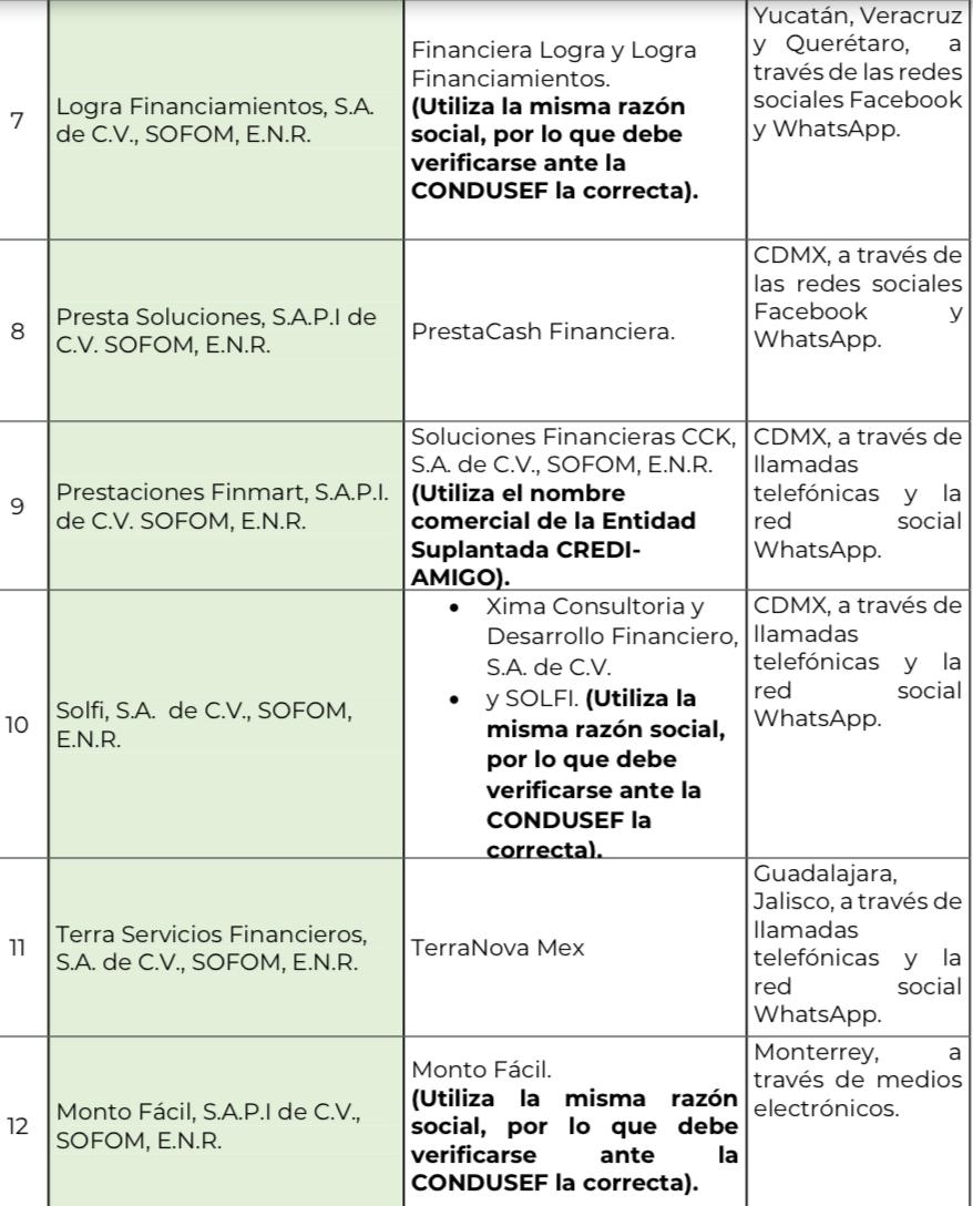 De acuerdo con la Condusef, en las últimas semanas, 14 Sofomes y dos Socap que están debidamente inscritas en el Sistema de Registro de Prestadores de Servicios Financieros (Sipres) denunciaron el uso para fraude y suplantación de su nombre comercial e incluso algunos de sus datos fiscales o administrativos.
