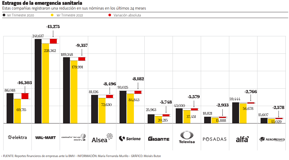 En dos años, desde que iniciaron las medidas de confinamiento en México por la pandemia, en abril de 2020, y que fueron retiradas en su mayoría de las entidades en el mismo mes pero de este año, Elektra, Walmart, América Móvil, Alsea, Soriana, Gigante, Televisa, Posadas, Alfa y Aeroméxico fueron las 10 empresas que cotizan en la Bolsa Mexicana de Valores (BMV) que más perdieron empleados.