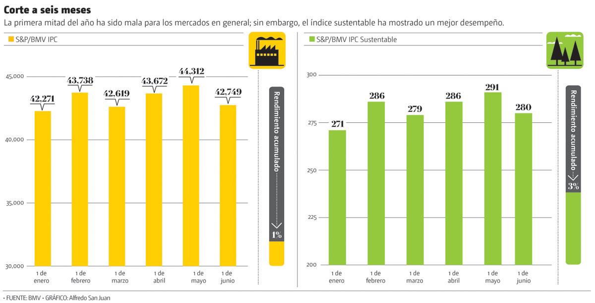 En el Día Mundial del Medio Ambiente, la Bolsa Mexicana de Valores (BMV) informó que de 2011 a la fecha, el rendimiento del índice accionario que está conformado por empresas sustentables (S&P/BMV IPC Sustentable) ha sido de 31 por ciento, por arriba del principal indicador del mercado (S&P/BMV IPC), que fue de 15 por ciento.