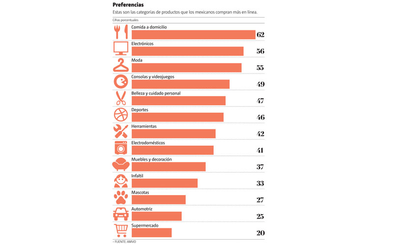 En contraste, los electrónicos y la categoría de moda, que por años habían liderado las preferencias de los consumidores en el canal digital, tuvieron una penetración de 56 y 55 por ciento, respectivamente.