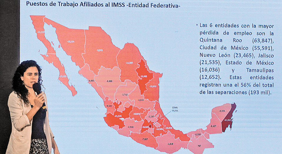 La secretaria del Trabajo, Luisa María Alcalde, precisó que las entidades con la mayor merma de plazas son Quintana Roo, con 63 mil 847; Ciudad de México, 55 mil 591; Nuevo León, 23 mil 465; Jalisco, 21 mil 535; Estado de México, 16 mil 36, y Tamaulipas, 12 mil 652.
