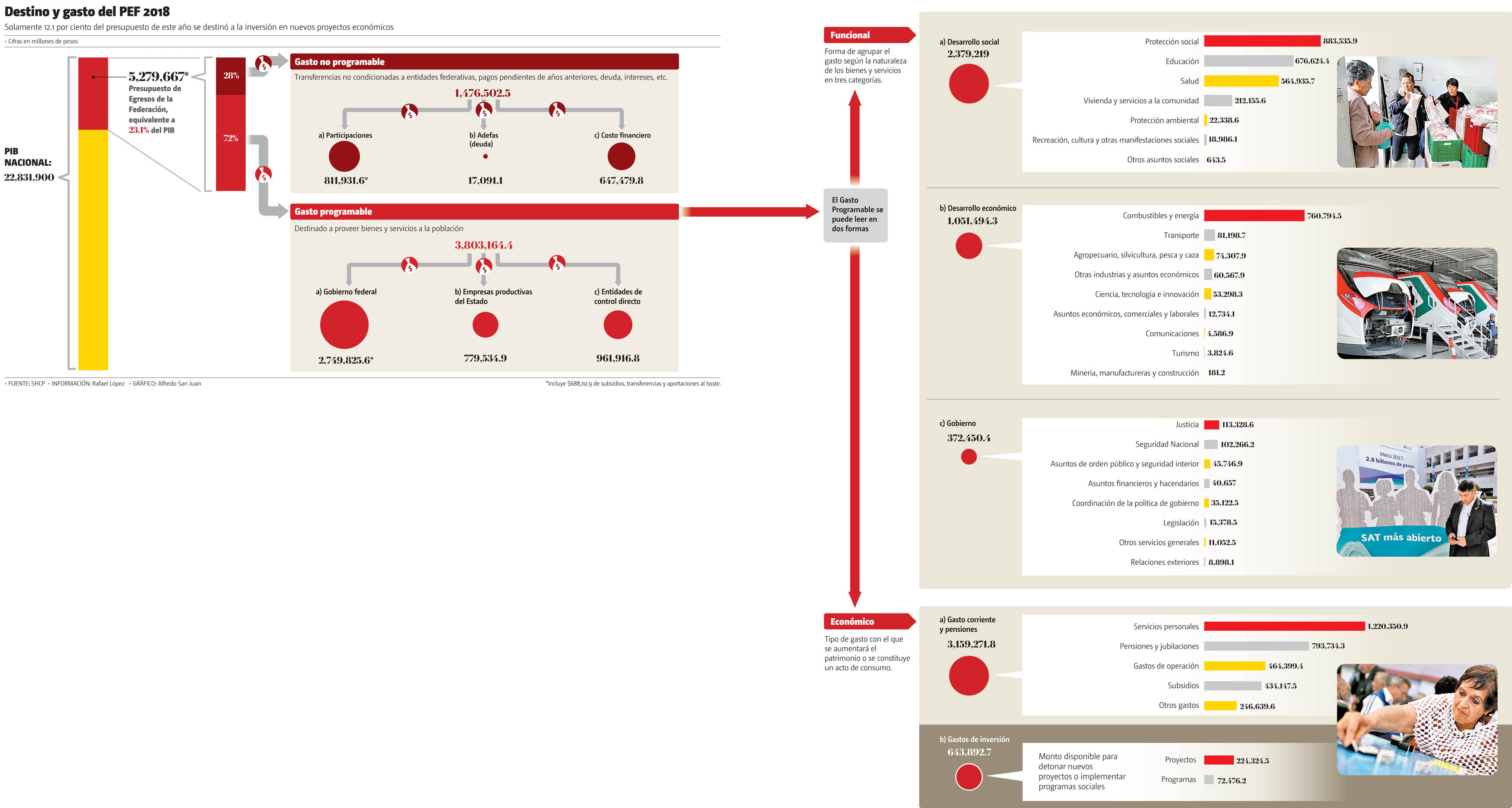 El presupuesto representó 23.1 por ciento del producto interno bruto, y allí se consideró que el gasto no programable, por un billón 476 mil 502 millones de pesos, incluyera 647 mil 479 millones para el costo financiero de la deuda y 811 mil 931 millones de pesos en Participaciones a estados y municipios.