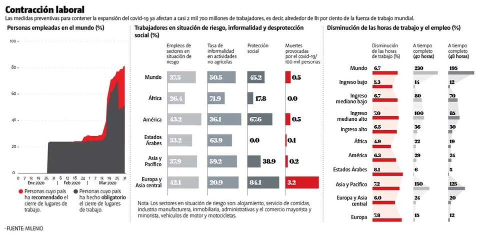 La agencia de las Naciones Unidas advirtió que mil 250 millones de trabajadores —casi dos quintas partes de la fuerza laboral global de 3 mil 300 millones— están empleados en sectores que sufren caídas drásticas en la producción, desde el sector minorista y de bienes raíces hasta la fabricación, el alojamiento y los servicios de alimentos. Más de cuatro quintas partes de la fuerza laboral mundial vive en países donde las medidas de cierre parcial o total están en vigor.