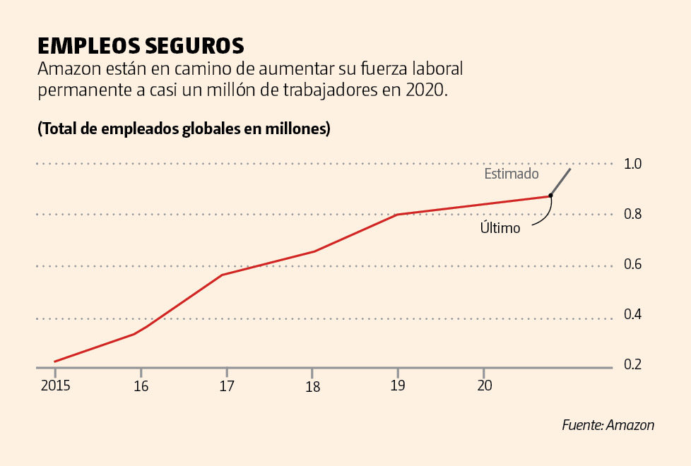 Tan solo en 2020, los objetivos de Amazon están en camino de aumentar su fuerza laboral permanente en más de 25%, a casi un millón. Dentro de eso, la compañía está en proceso de contratar a cerca de 30,000 empleados corporativos, con un salario promedio anual de 150,000 dólares.