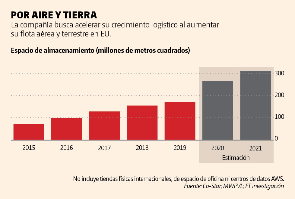 Entre 2018 y 2019, aumentó 15% su presencia logística global, asegurando más espacio de almacenamiento, centros de clasificación y centros de entrega en un esfuerzo por vencer a sus rivales. Este año, Olsavsky dijo que Amazon está en camino de agregar más de 50% a su capacidad.