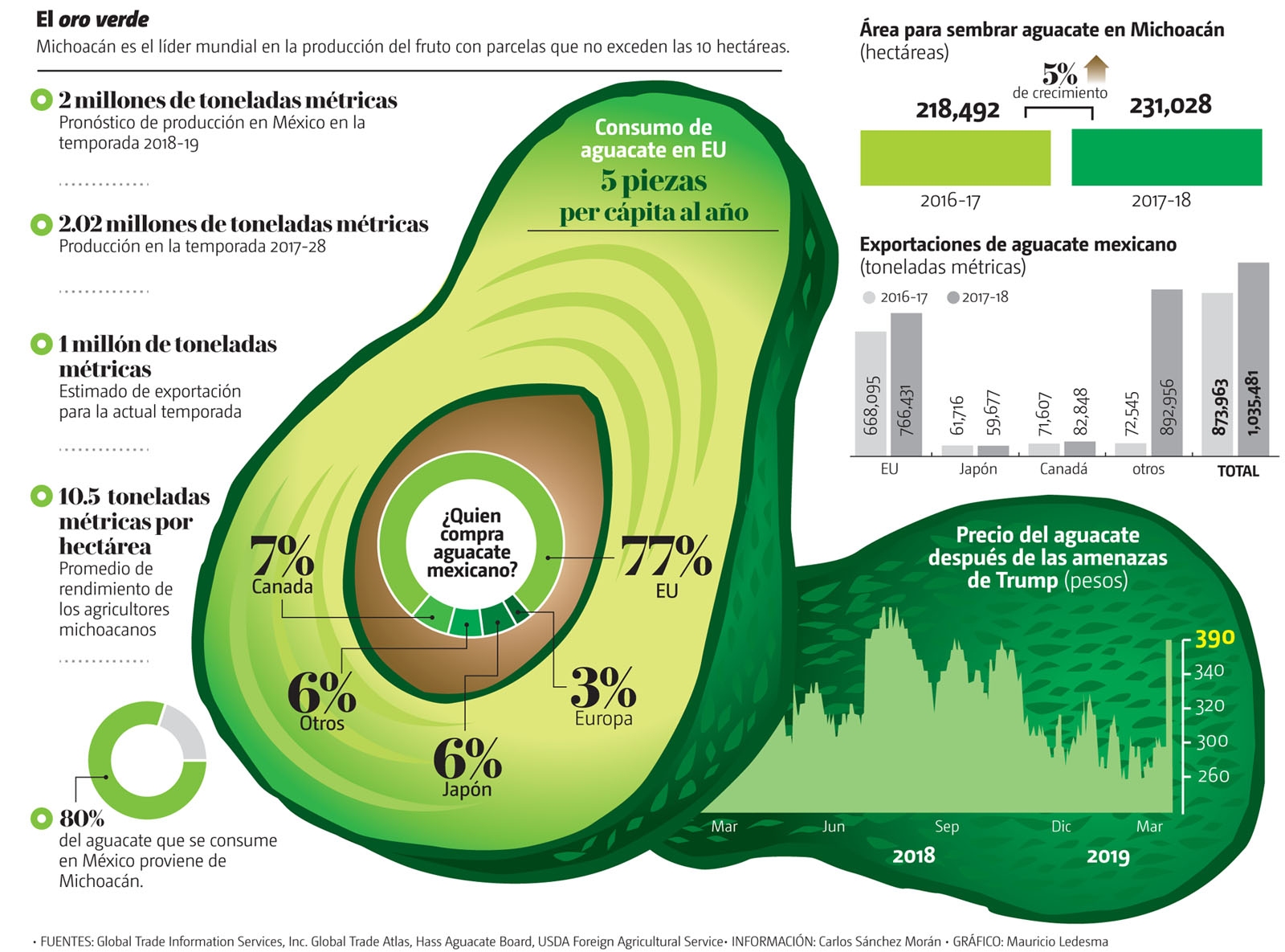 México surtió más de cuatro de cada cinco aguacates que se consumieron en Estados Unidos el año pasado, de acuerdo con el Departamento de Agricultura de EU (USDA, por su sigla en inglés). Michoacán es el mayor productor de aguacates a nivel mundial, representa 92 por ciento de la producción de esa fruta en el país.