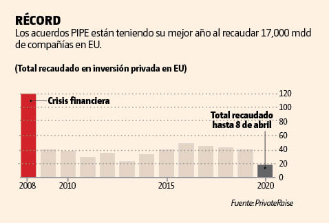 Pinedo dijo que el valor de los acuerdos de este año podría rivalizar con el de 2008, cuando compañías como Whole Foods, la cadena de supermercados y Legg Mason, un administrador de fondos, contribuyeron a un récord de 120,000 mdd en acuerdos PIPE en el apogeo de la crisis financiera.
