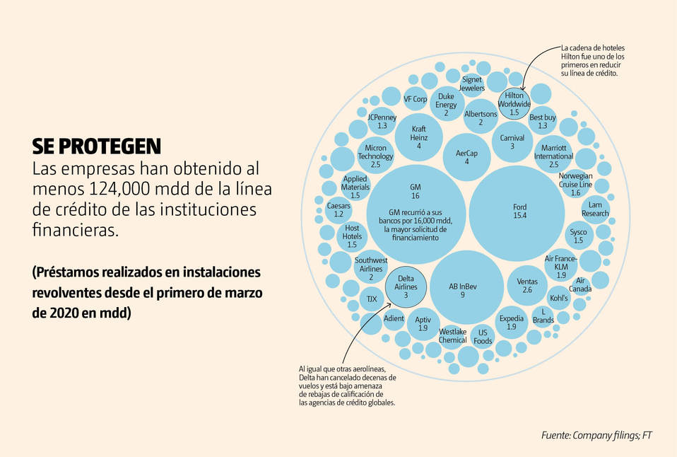 El grupo automotriz Ford tomó prestados 15,400 mdd y anunció que cerraría las fábricas para conservar efectivo; el grupo cervecero Anheuser-Busch InBev recaudó 9,000 mdd cuando se cerraron los grifos; y TJX, el propietario de TJ Maxx, y Kohl's, dispuso de 1,000 mdd para cada uno cuando cerraron tiendas.