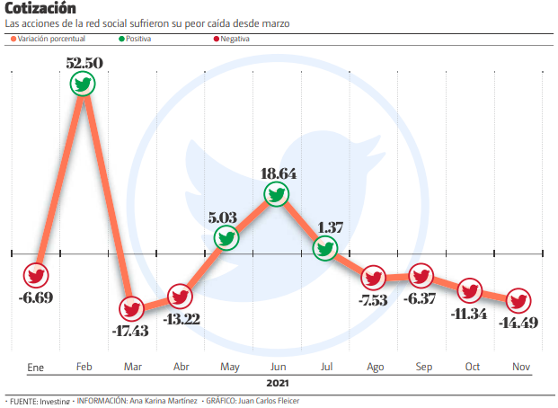 El precio de las acciones de Twitter se mantenía sin cambios en las operaciones del mediodía en Nueva York. Se había disparado hasta 10 por ciento en las operaciones antes de la apertura de mercado después de que se informó la noticia en CNBC; sin embargo, cerró con una baja de 2.74 por ciento.