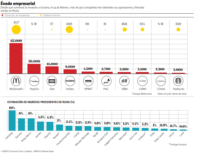 En un aparente efecto dominó, varias compañías globales anunciaron su retiro de Rusia el martes y el miércoles. Entre ellas, PepsiCo y Unilever, pero la suspensión de sus operaciones solo fue parcial. PepsiCo, por ejemplo, que emplea a 20 mil personas en Rusia, suspendió las ventas de marcas globales de bebidas, incluido el refresco de cola que lleva su nombre, pero mantiene las ventas de alimentos y marcas locales, incluso de su gran operación de productos lácteos.