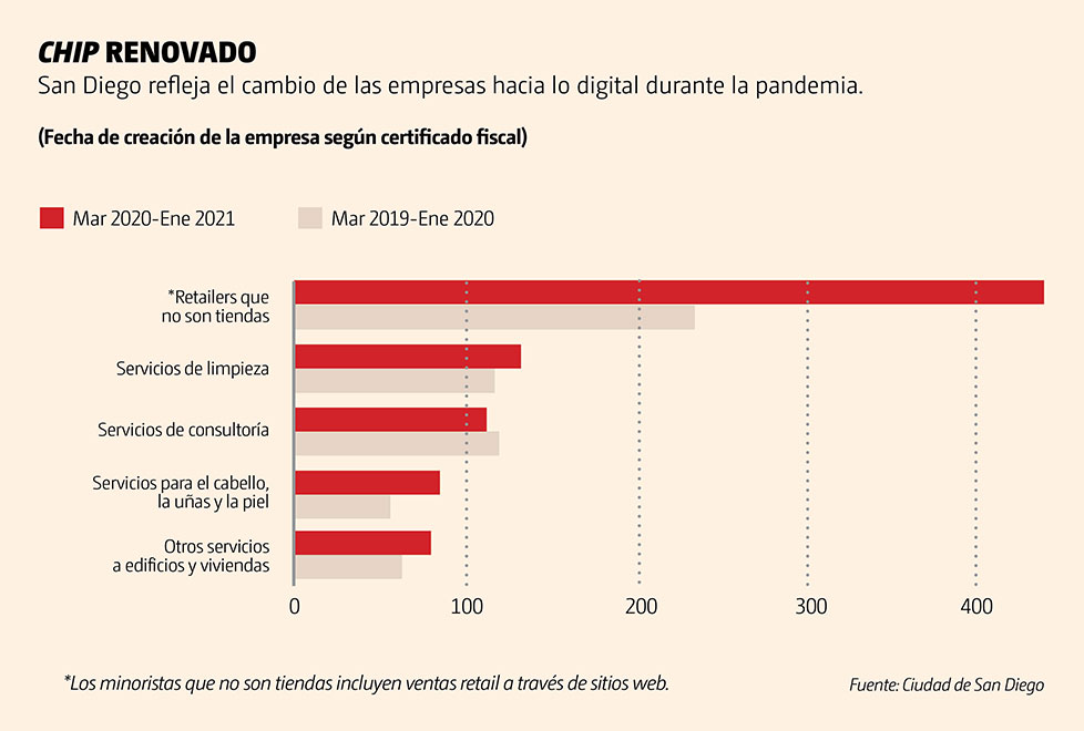 “Tuve que renunciar a mi trabajo por la pandemia para poder cuidar de mi hija; manejar mi negocio desde casa fue ideal”. Harris, Zive y Brantveyn viven en San Diego, donde las estadísticas de formación de empresas reflejan el cambio más amplio hacia el internet acelerado por la pandemia.