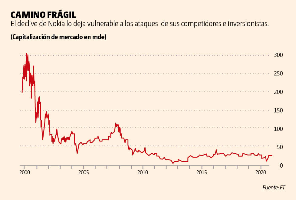 Después estuvo en la cresta de la ola como un célebre campeón nacional y el mayor fabricante de teléfonos móviles en el mundo, con una capitalización de mercado máxima cercana a 300,000 millones de euros (mde). Lundmark regresó a un Nokia muy diferente de la que dejó.