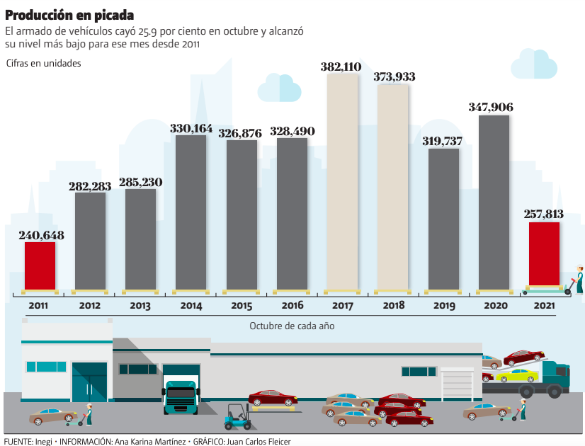 Los problemas con los chips que se sienten en todo el mundo golpean con fuerza a América del Norte, y México experimenta un mayor impacto, ya que depende de los automóviles para más de 3 por ciento de su producto interno bruto (PIB). Los datos publicados ayer por el Instituto Nacional de Estadística y Geografía (Inegi) muestran que la producción automotriz en la segunda mayor economía de América Latina en octubre se ubicó en su nivel más bajo para ese mes desde 2011.