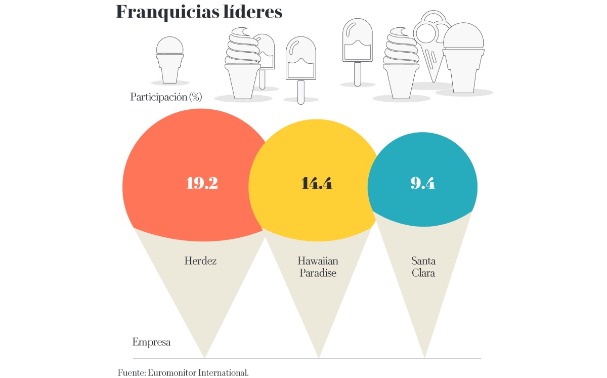 El mercado se encuentra liderado por Herdez, dueño de Nutrisa y Moyo, que tiene 19.2 por ciento del total; detrás se encuentra Franquiciadora Hawaiian Paradise, con 14.4 por ciento; y finalmente Santa Clara productos lácteos, con 9.4 por ciento de participación.