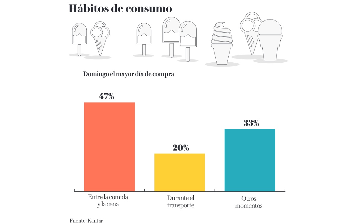 La investigadora de la industria de consumo Kantar estimó que en el último año dos de cada 10 veces que se consumió helado fue en el transporte; 47 por ciento de las veces que se disfrutan los helados y paletas entre la comida y la cena; y los domingos son los días que más se compran.