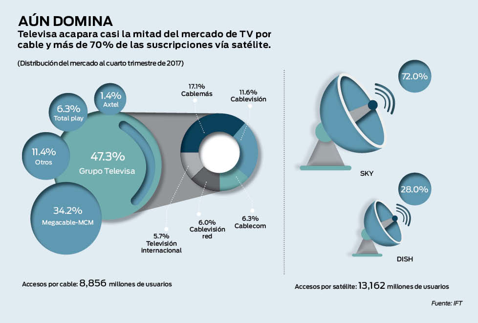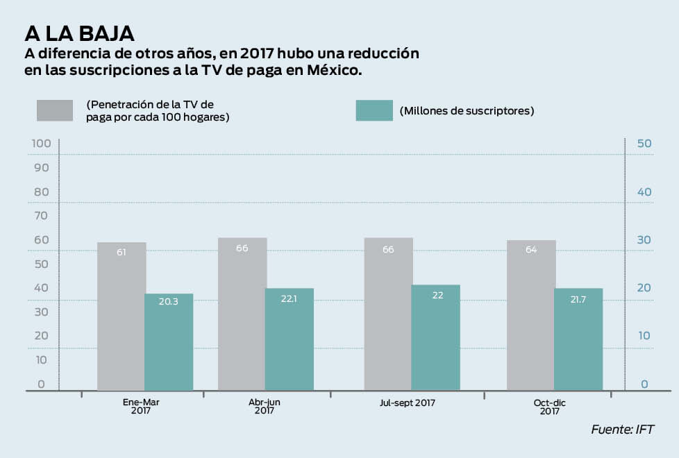 No obstante, en el tercer trimestre de 2017, el porcentaje de personas que vieron canales de paga se redujo a 27.7%, mientras que los canales nacionales de televisión abierta fueron sintonizados por 45.8% de la audiencia, según el reporte del IFT. En su Cuarto Informe Trimestral Estadístico de 2017, el Instituto calculó más de 21 millones de accesos residenciales a la televisión restringida, una reducción de 3% frente al mismo periodo de 2016.