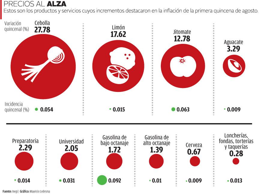Durante la primera quincena de agosto la inflación se ubicó en 0.34 por ciento, pero un tercio (0.092 por ciento) fue consecuencia del aumento en los precios de la gasolina Magna, rubro que ganó influencia en la nueva medición del Índice Nacional de Precios al Consumidor elaborado por el Instituto Nacional de Estadística y Geografía (Inegi).