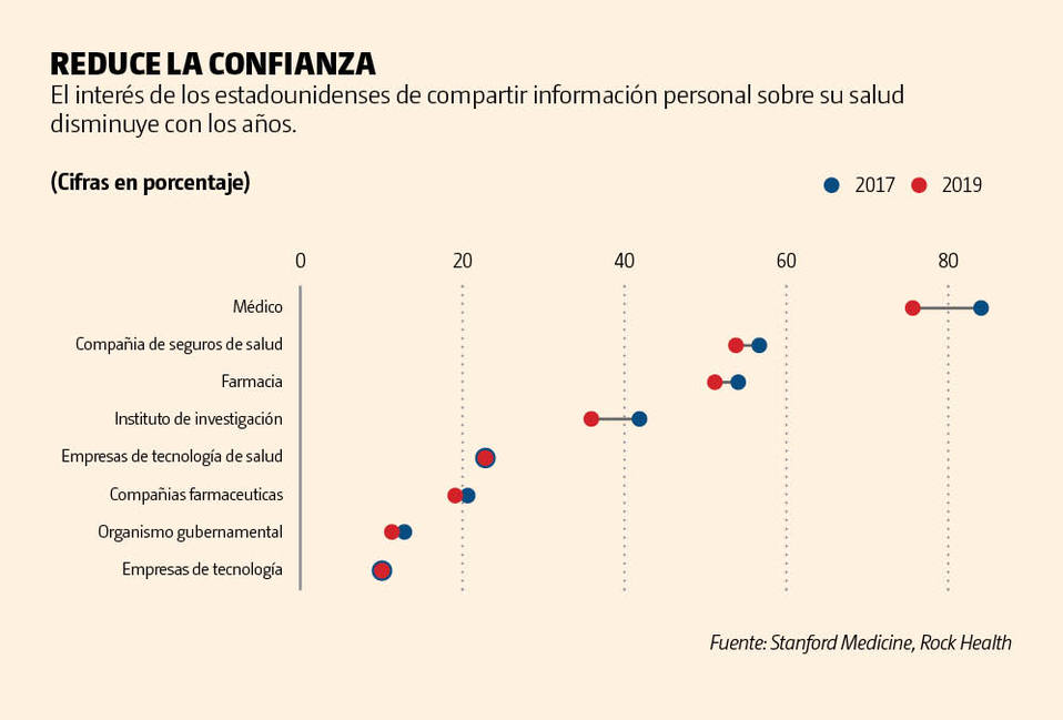 Pero algunas personas en el sector no están de acuerdo. Unity Stoakes, presidente de StartUp Health, que organizó el evento donde habló Feinberg, dice que Google está integrado “en el tejido de nuestras vidas” con las búsquedas y los smartphones. “La gente confía en estas compañías”, dice. En realidad, Google puede ser considerado como el mejor de un grupo de malos: en una encuesta de Rock Health que se realizó a principios de este año, solo 11% de los consumidores dijeron que estaban dispuestos a compartir datos de salud con compañías de tecnología.