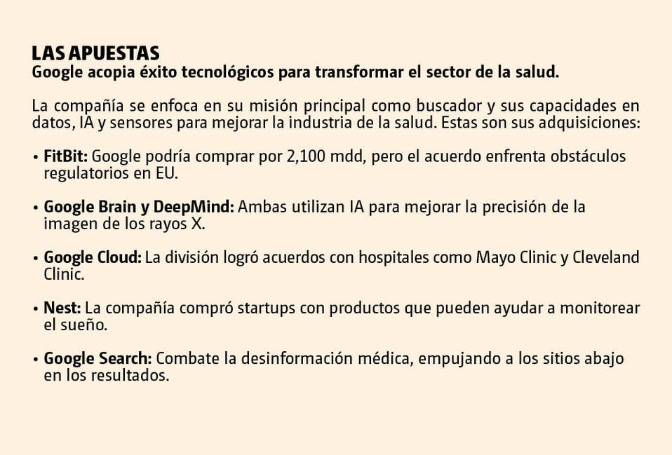 Aunque la compañía no ha sido tan específica acerca de sus posibles planes, su visión es construir un Asistente de Google para tu salud, de acuerdo con Eric Topol, autor de libro Deep Medicine. Podría combinar registros de salud electrónicos con datos de smartphones, genomas, información de sensores como monitores de glucosa e incluso aplicaciones que registran los hábitos alimenticios, dice.