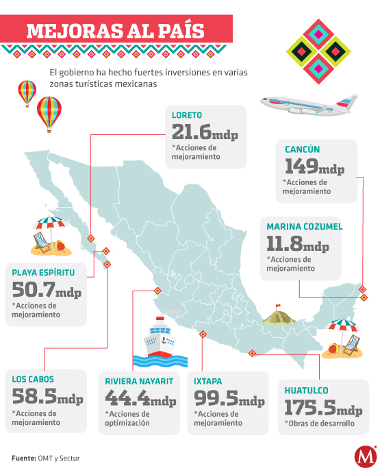 Las inversiones que se realizaron en el sexenio para mejorar destinos como Cancún, Marina Cozumel, Ixtapa, Los Cabos, Loreto, Huatulco, Playa Espíritu o Riviera Nayarit; así como la facilitación migratoria; la promoción del país; el convenio aéreo con Estados Unidos para eliminar restricciones, y el programa Conéctate al Turismo, que hizo que las empresas hoteleras sustituyeran sus importaciones por compras con proveedores nacionales, han sido las piezas clave.