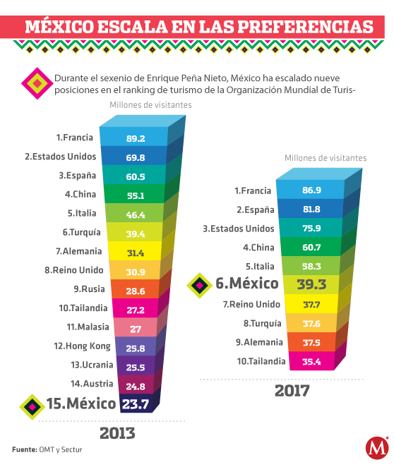 El presidente Enrique Peña Nieto está a unos cuantos meses de terminar su administración, y si algo puede presumir es haber regresado a México a los reflectores mundiales del turismo, dado que con base en inversión en emblemáticos destinos turísticos y en mejorar la golpeada imagen de la nación por los altos niveles de inseguridad, llevó al país de la posición 15 en el ranking de la Organización Mundial de Turismo (OMT) a la sexta.
