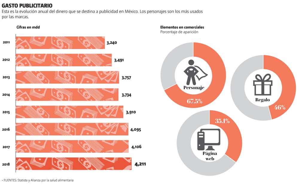 Según cifras de la Alianza por la Salud Alimentaria, de la distribución de comerciales totales, cerca de 67 por ciento involucran personajes; 46 por ciento, regalos; y 35.10 por ciento, páginas web.