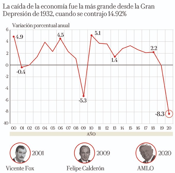 El producto interno bruto (PIB) de México, es decir la suma de los bienes y servicios producidos en el país, registró una caída de 8.3 por ciento en 2020, la caída más profunda desde la Gran Depresión, y la magnitud de la contracción fue superior a la registrada en la crisis de 2008-2009, cuando el PIB cayó 5.3 por ciento. Se estima que la recuperación en 2021 será alrededor de 4 por ciento, insuficiente para regresar a los niveles pre pandemia.