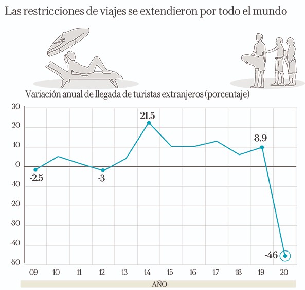 Durante todo 2020 solamente llegaron al país 24.3 millones de turistas extranjeros, una caída de 46 por ciento en comparación con 2019, y la peor en la historia del turismo en el país, de acuerdo con el Centro de Investigación y Competitividad Turística Anáhuac (Cicotur). La recuperación de esta actividad se estima a largo plazo.