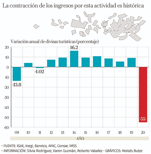 Del lado de las divisas generadas por los viajeros de otros países, el descenso fue de 55 por ciento, el mayor de su historia. Datos del Banco de México (Banxico) y el Instituto Nacional de Estadística y Geografía (INEGI) muestran que antes de esta crisis, los mayores descensos en este indicador se dieron en 2009, derivado de la crisis financiera y de vivienda en Estados Unidos.