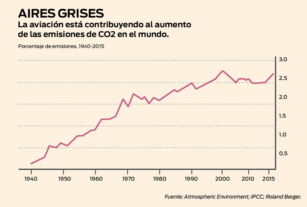 Los viajes aéreos representan 2% de las emisiones en todo el mundo. Pero con el tráfico aéreo que se duplica cada 15 años, las emisiones de la aviación aumentan de 4.5 a 6% cada año, de acuerdo con la alianza de investigación público-privada Clean Sky de la Unión Europea. Roland Berger estima que podrían representar 10% del total en 2050.