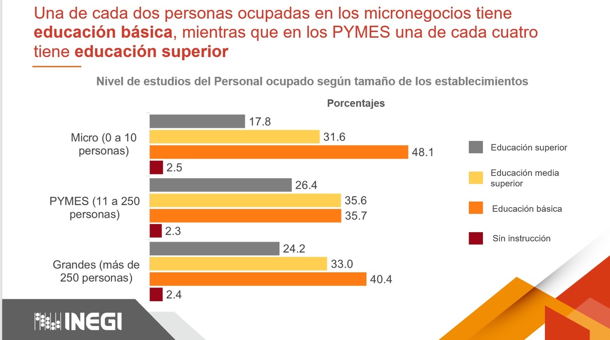 En cuanto al resultado en las pequeñas y medianas empresas (Pymes) 35.7 por ciento cuentan con educación básica, 35.6 con media superior, 26.4, superior y 2.3 por ciento no tiene estudios.