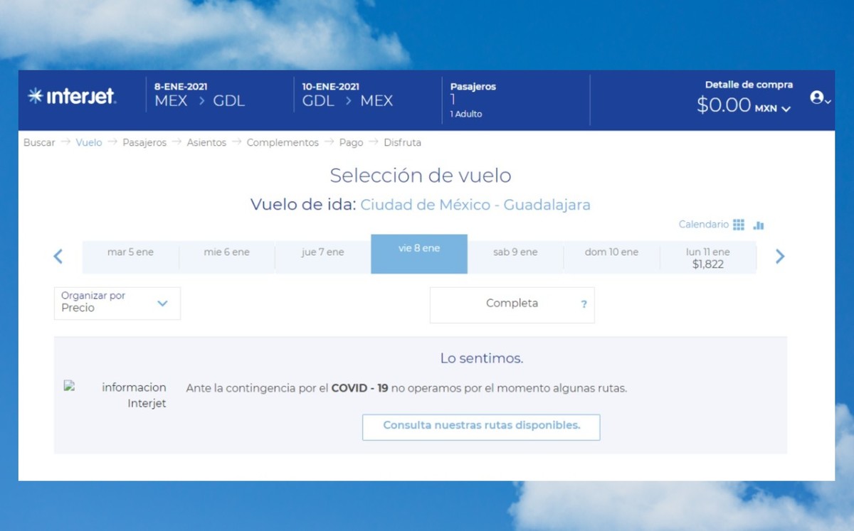 MILENIO realizó un ejercicio para la compra de boletos en el portal de la aerolínea, con lo cual se pudo verificar que en todos sus vuelos del primero al 10 de enero aparece el mensaje “ante la contingencia por el covid-19 no operamos por el momento algunas rutas”.
