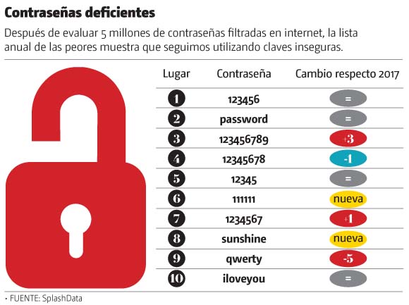 Tras evaluar cinco millones de contraseñas filtradas en internet, la lista anual de las peores muestra que se siguen utilizando las mismas.