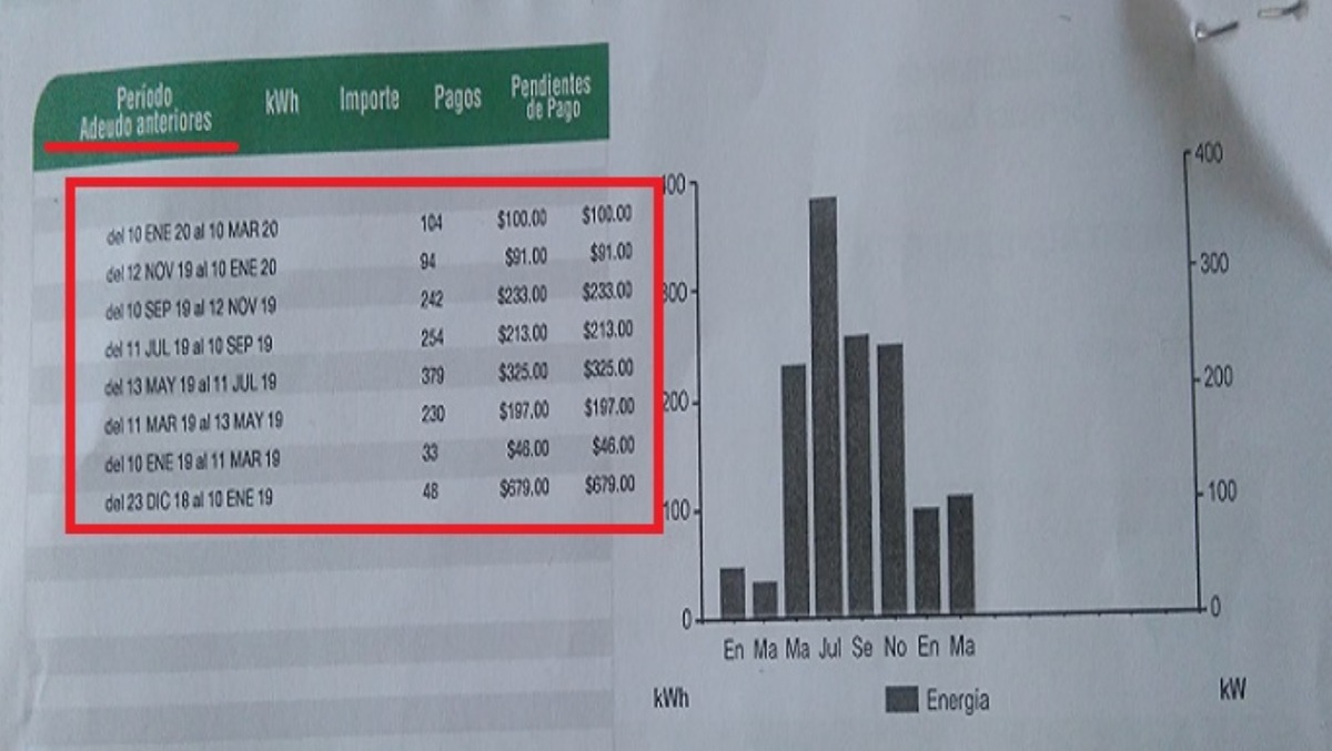 En esta sección del recibo está una línea de colores que va de verde a rojo, la cual representa un gráfico, a menor nivel de consumo de luz, existe un mayor apoyo gubernamental.