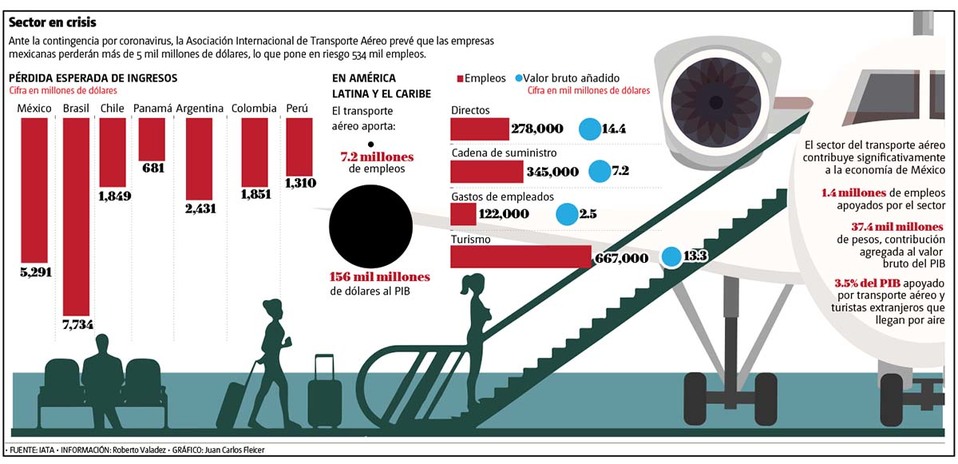 La Asociación Internacional de Transporte Aéreo (IATA) estimó que las aerolíneas mexicanas perderán 5 mil 300 millones de dólares por la crisis del covid-19 en 2020, por lo que se necesita una ayuda de liquidez y aplazamiento en pago de impuestos.