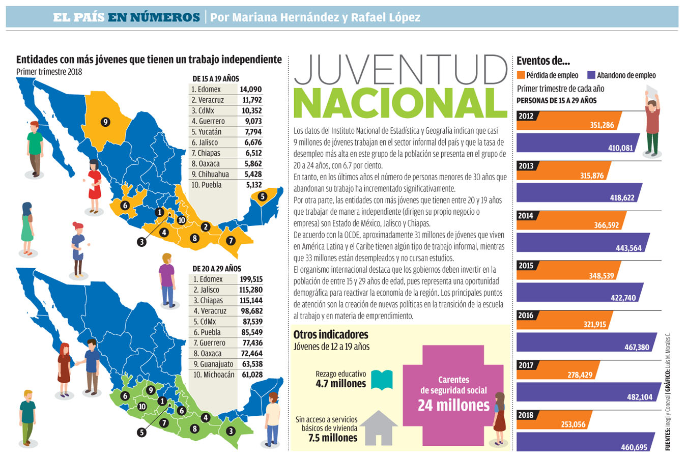 Los datos del Instituto Nacional de Estadística y Geografía indican que casi 9 millones de jóvenes trabajan en el sector informal del país y que la tasa de desempleo más alta en este grupo de la población se presenta en el grupo de 20 a 24 años.