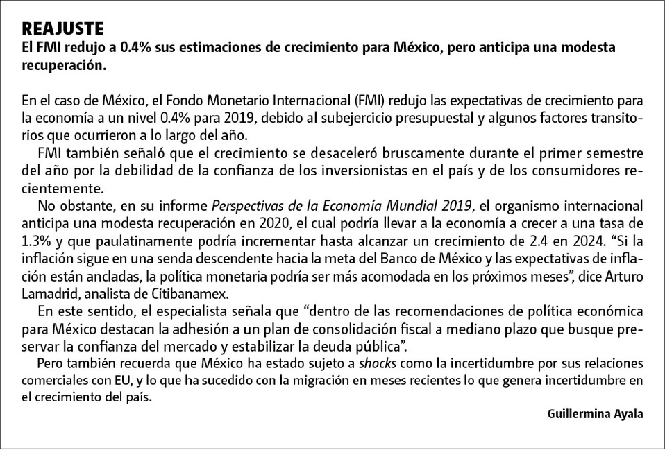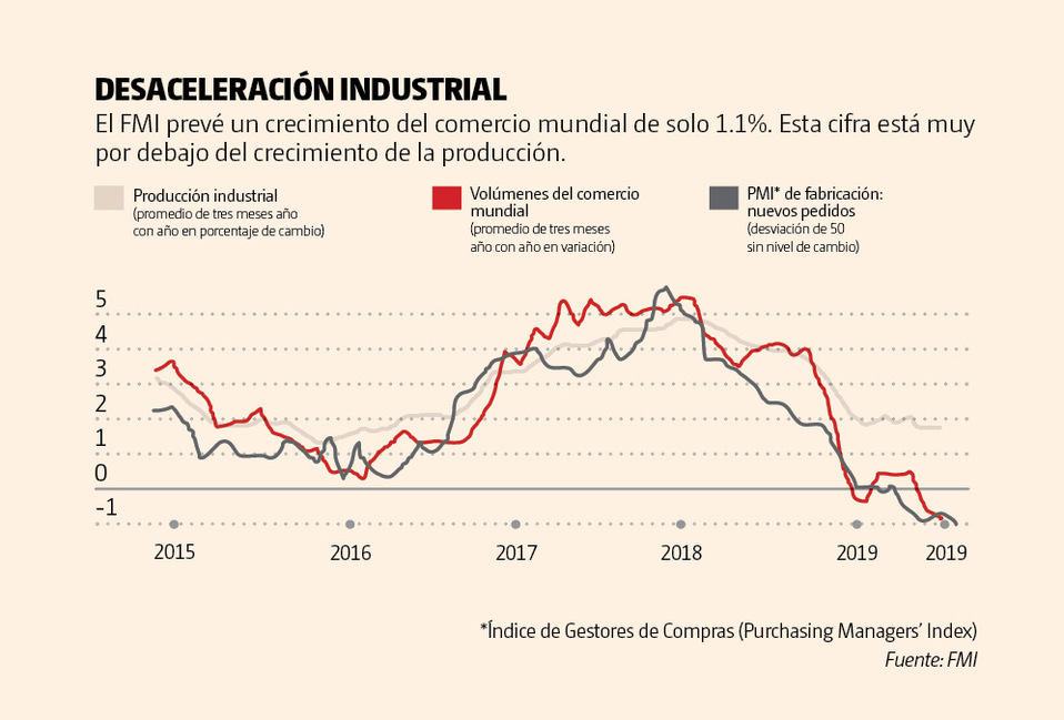 En su último informe sobre Perspectivas de la Economía Mundial, el FMI prevé un crecimiento de la producción mundial de solo 3% este año, en comparación con 3.6% en 2018. En las economías de altos ingresos, el crecimiento agregado previsto es de 1.7%, una caída con respecto al que registró el año pasado (2.3%).