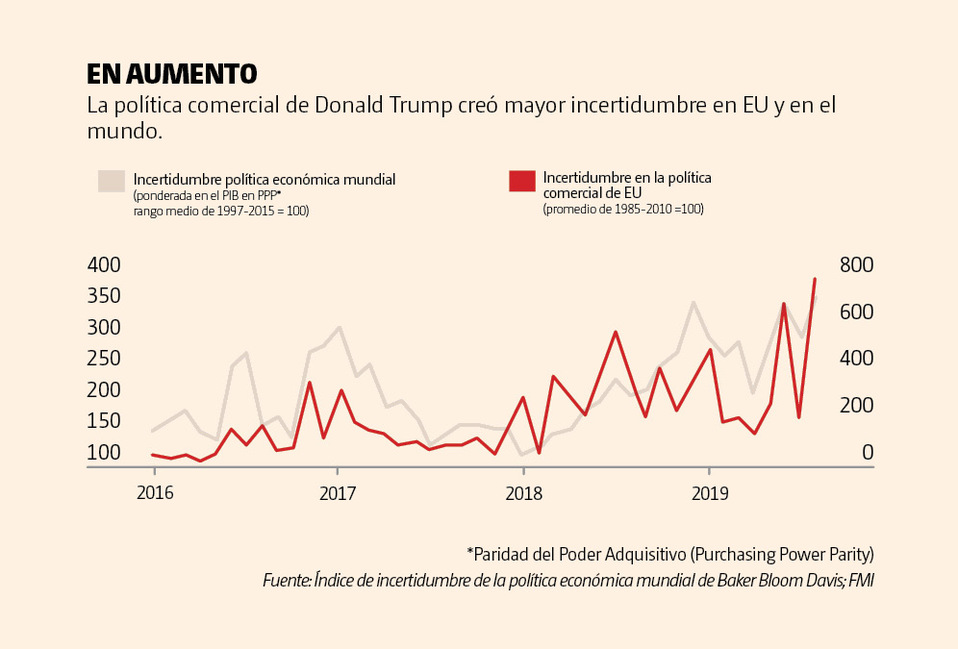 ¿Qué provoca esta desaceleración, especialmente marcada en la industria y el comercio? Gran parte de la respuesta parece ser la creciente incertidumbre. Esta, dicen los autores de Brookings, se debe a las “tensiones comerciales persistentes, a la inestabilidad política, a los riesgos geopolíticos y a la preocupación sobre la eficacia limitada de los estímulos monetarios”. Esa incertidumbre, señala Gavyn Davies, se “arraigó”.