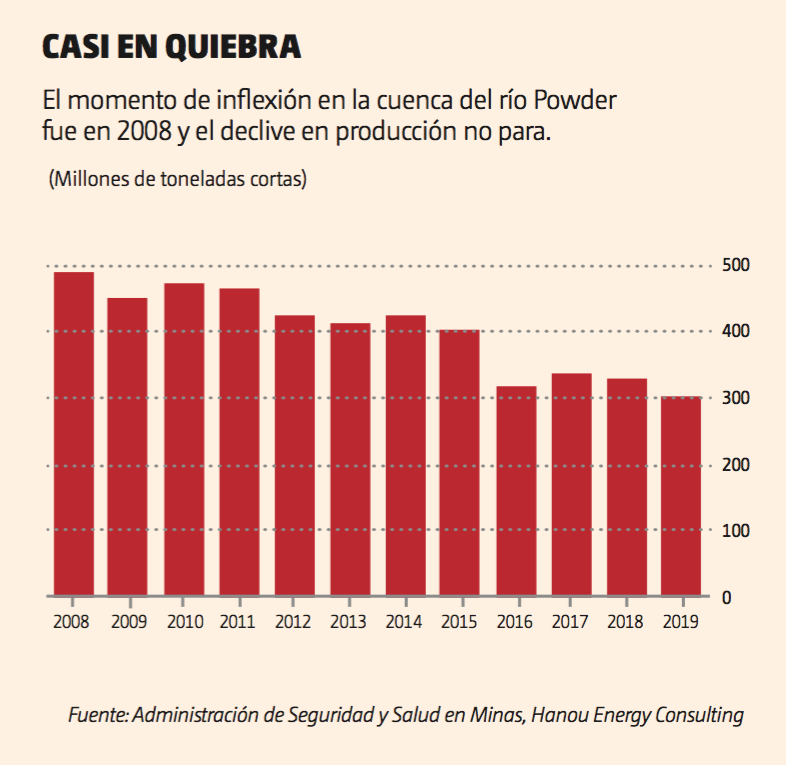 La cuenca del río Powder, que se explota desde la década de 1970, se convirtió en la región carbonífera más prolífica de EU. La producción alcanzó su punto máximo en 2008, con 496 millones de toneladas cortas.