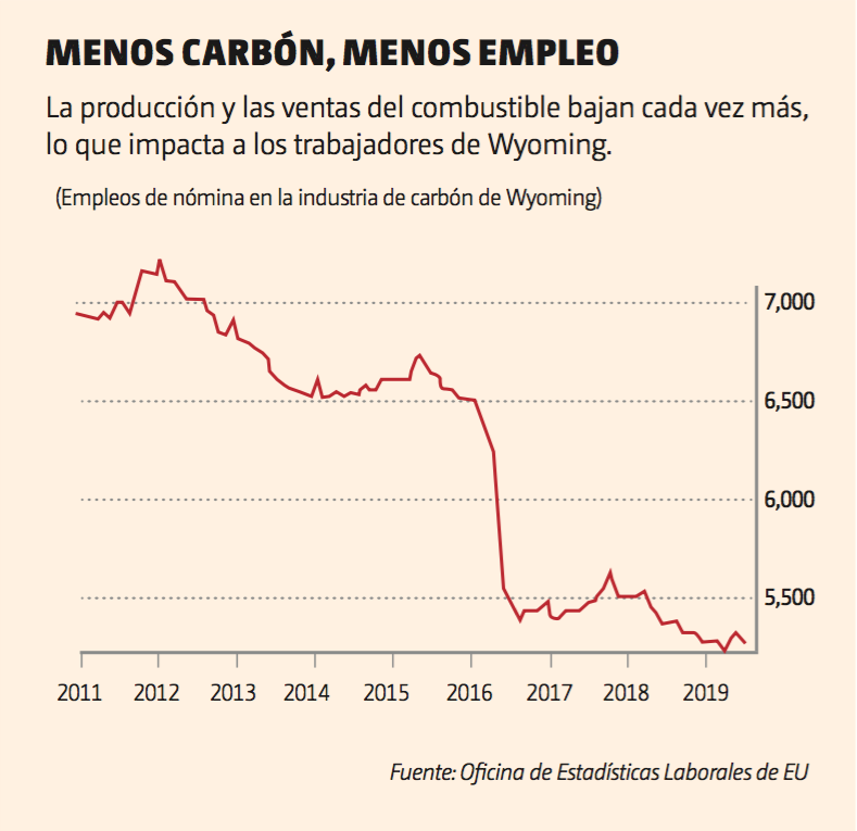 Trump acuñó el término “carbón limpio y hermoso”. En un mitin en Montana en noviembre pasado, dijo que los mineros de carbón estaban “todos de regreso en su trabajo”. Se crearon alrededor de 2,000 nuevos empleos en el sector, para llegar a 53,000 desde su toma de protesta, pero el número permanece muy por debajo de los niveles a principios de la década. Por su parte, el empleo minero en Wyoming se contrajo.